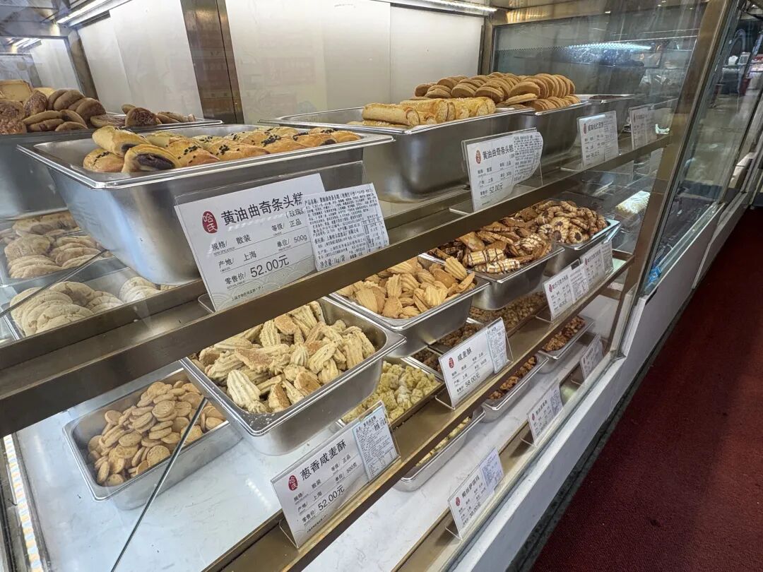 在第二食品商店的商品区,南区老大房、老半斋、功德林的糕点摆满货架。苔条饼散发着大海与面粉交织的独特香气。老上海的萨琪玛,一改如今软糯的口感,呈现出脆硬的口感,甜而不腻。蝴蝶酥、条头糕则是阿拉爷叔、姆妈的心头好,轻轻一抿,那股质朴的甜香就在齿间晕开。
