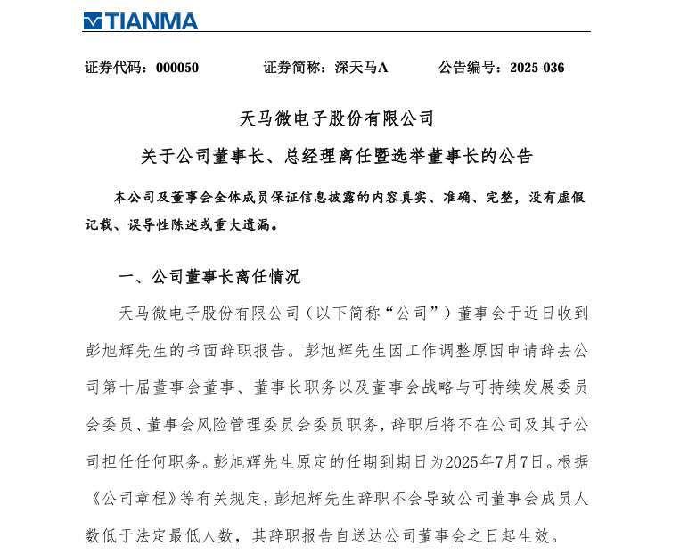 深天马6月12日公告,彭旭辉因工作调整原因申请辞去公司董事、董事长等职务,辞职后将不在公司及其子公司担任任何职务。公司召开董事会会议,同意选举成为为公司董事长。