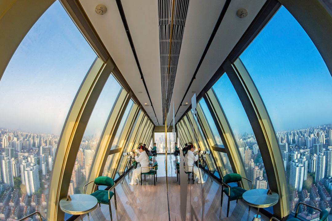 3、乘电梯至环球港52层观光平台,俯瞰普陀城廓及观光平台游人活动,捕捉人与城的互动瞬间。