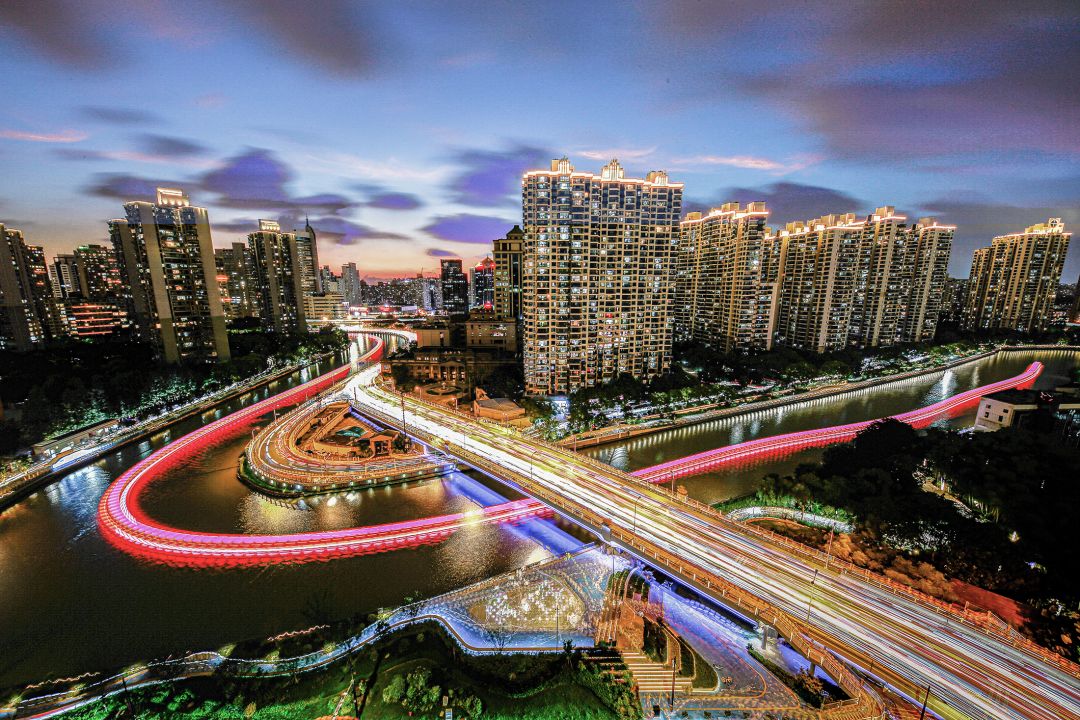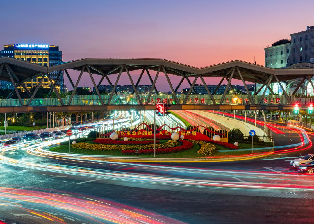 中环线金沙江路真北路交会处,是拍出“城市脉动”的好地方。傍晚时分,天桥上的慢门摄影能让车流化作光影绸带。