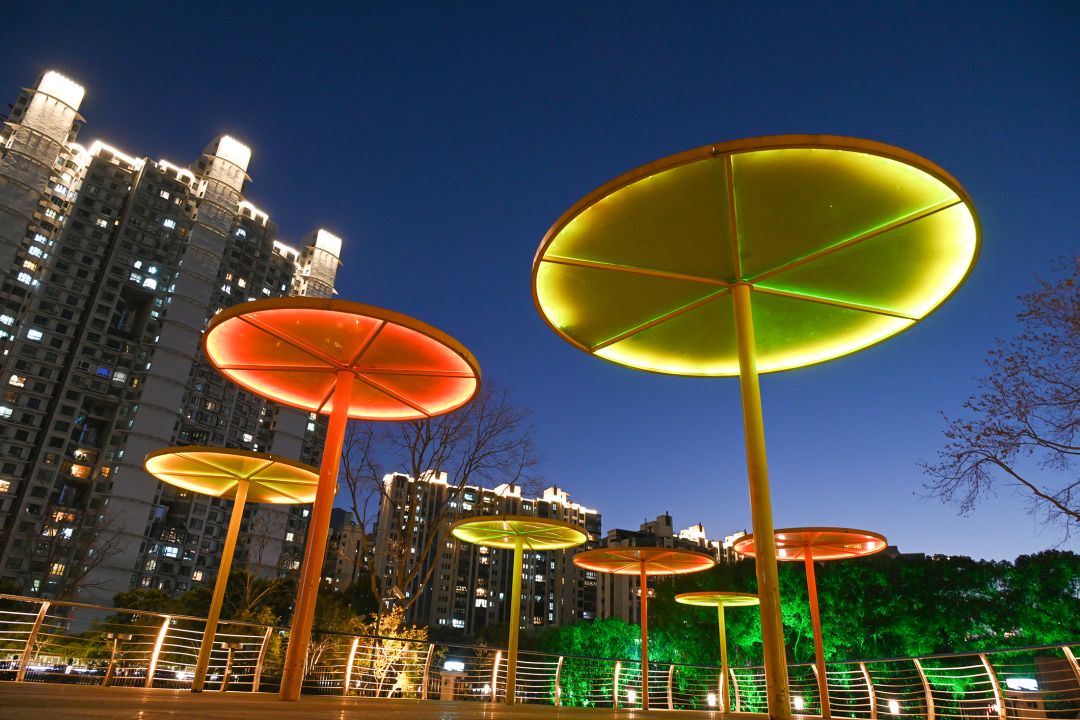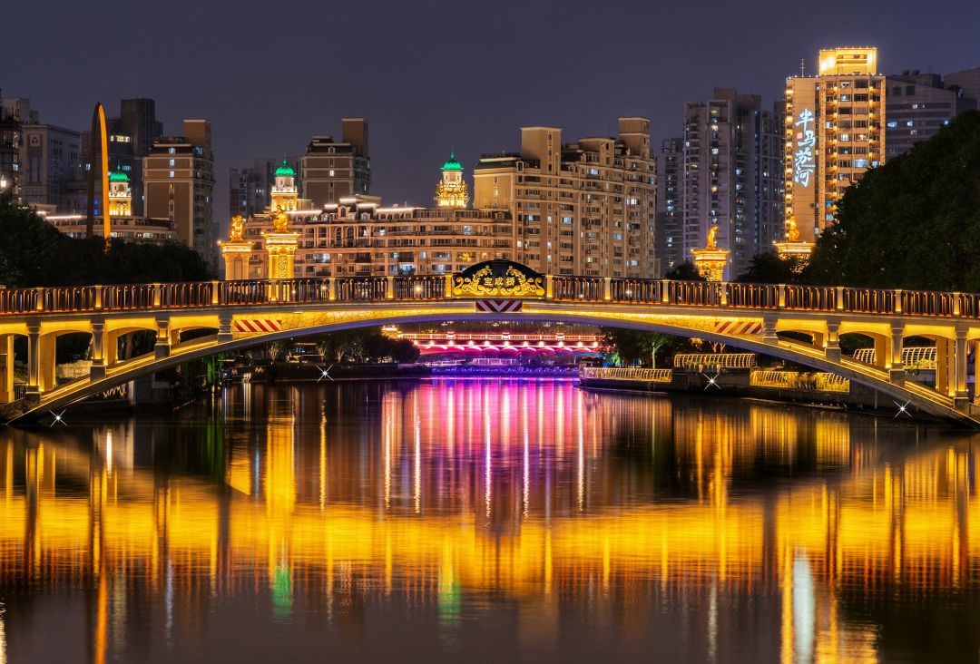 江宁路桥在节日张灯结彩时尤为动人,高楼俯拍,能同时收下桥、河与人的活动场景。