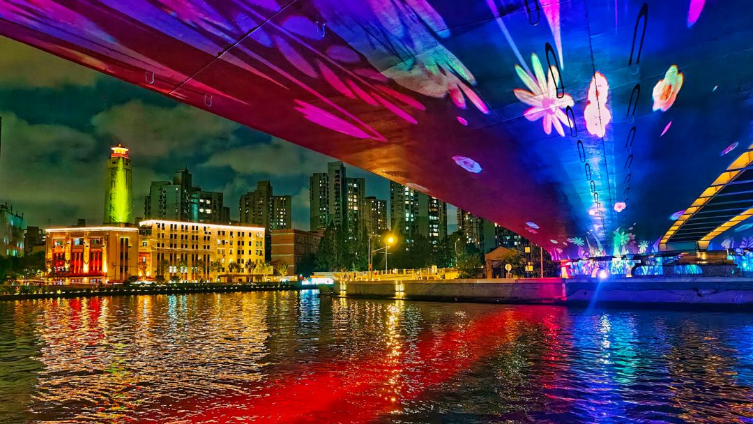 武宁路桥在节假日有水幕瀑布和灯光字样时格外上镜,桥下往来的人群与灯光,也为画面增添了生活气息。