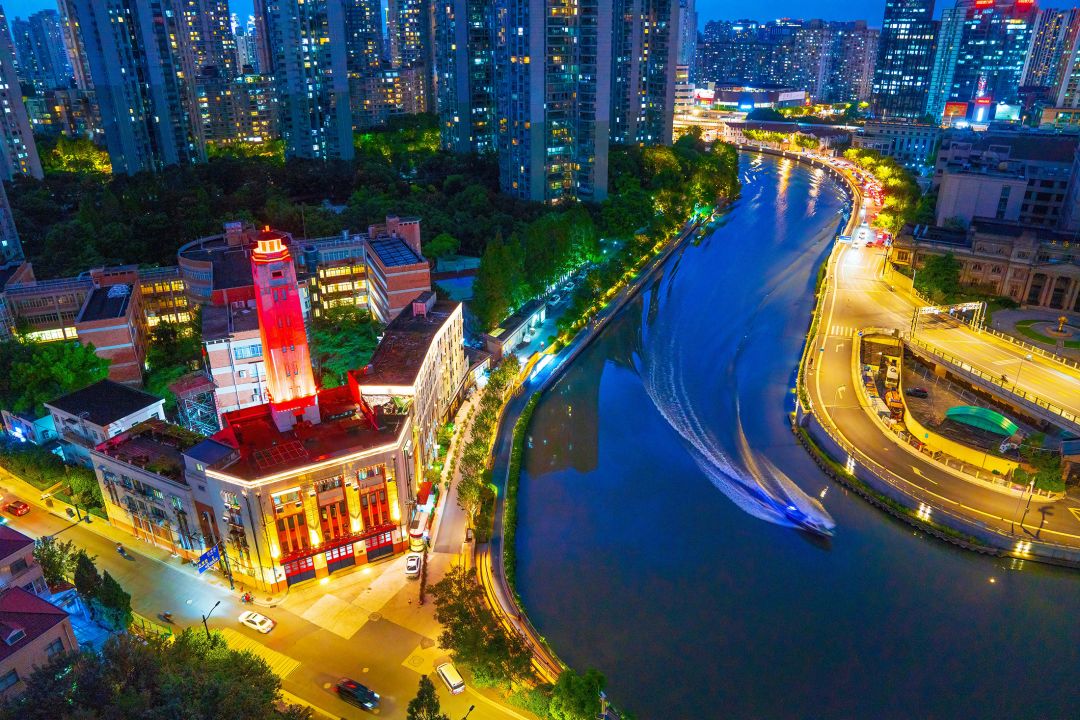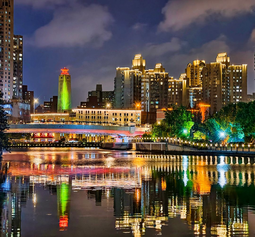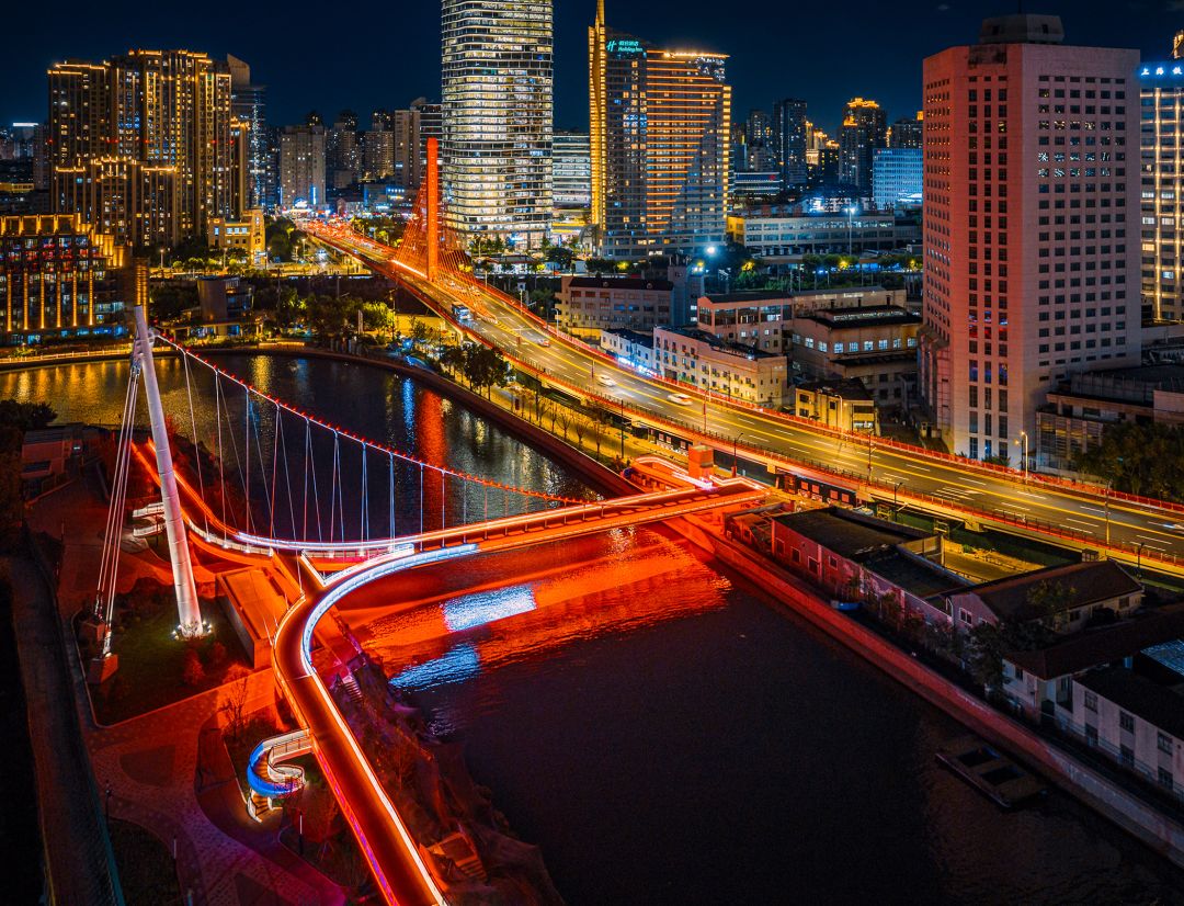 宝成桥适合登高拍摄,创享塔楼顶的休闲空间让你轻松俯瞰苏州河东西流向。河流的弯道正好把桥体推向视觉中心,夜晚两岸灯光亮起,又是另一番风味。